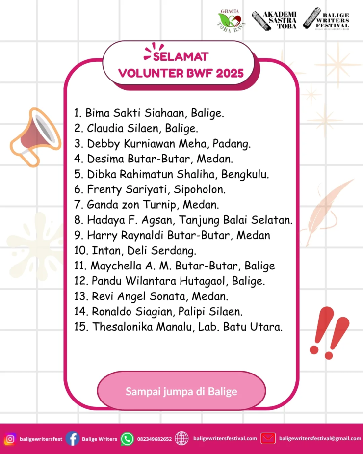 Buat nama-nama yang tertera, sampai jumpa di Balige! Panitia akan menghubungi kalian via WhatsApp.
